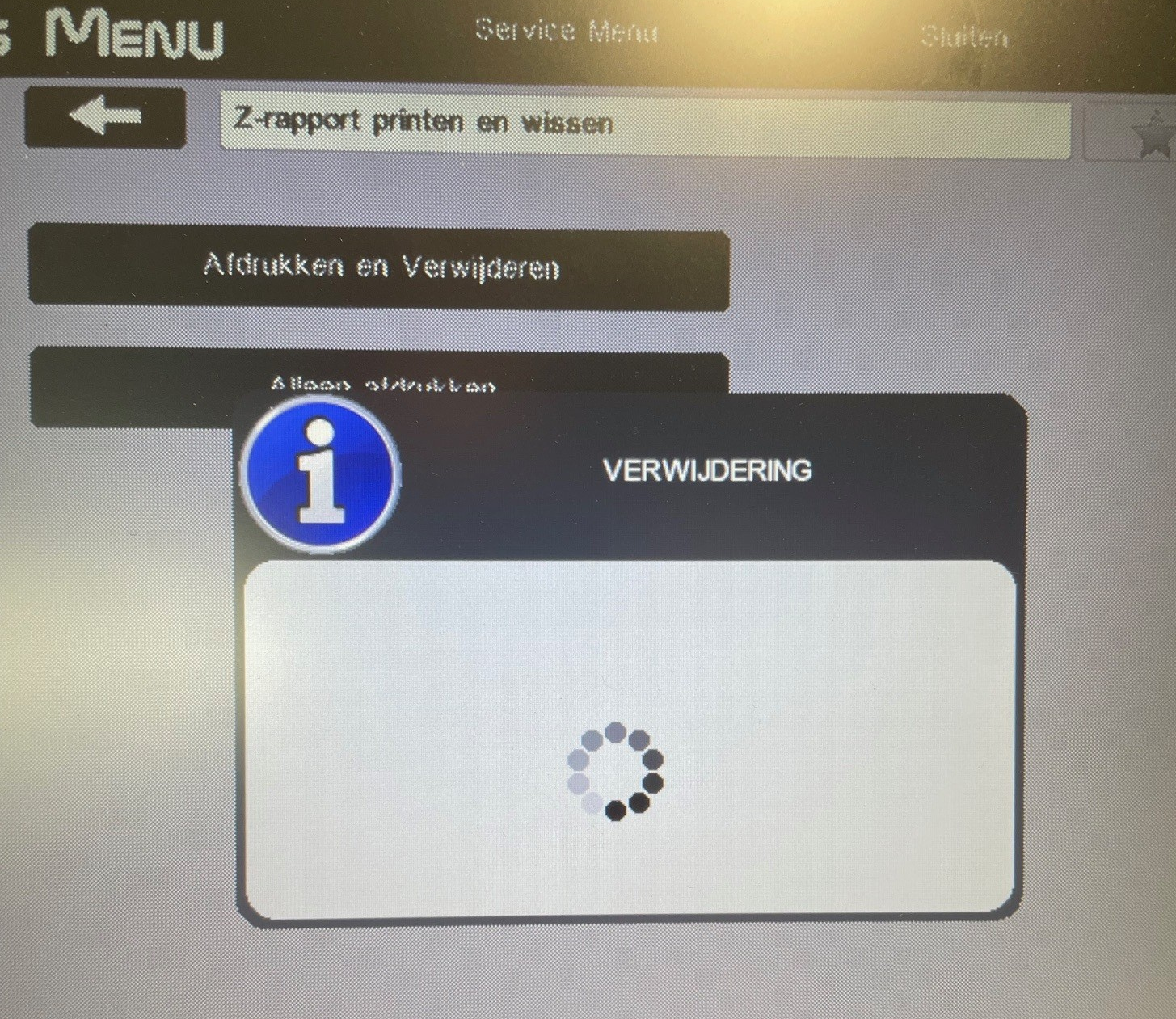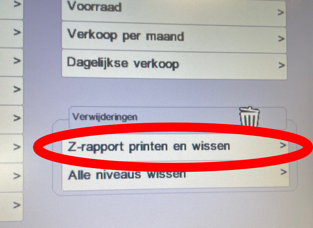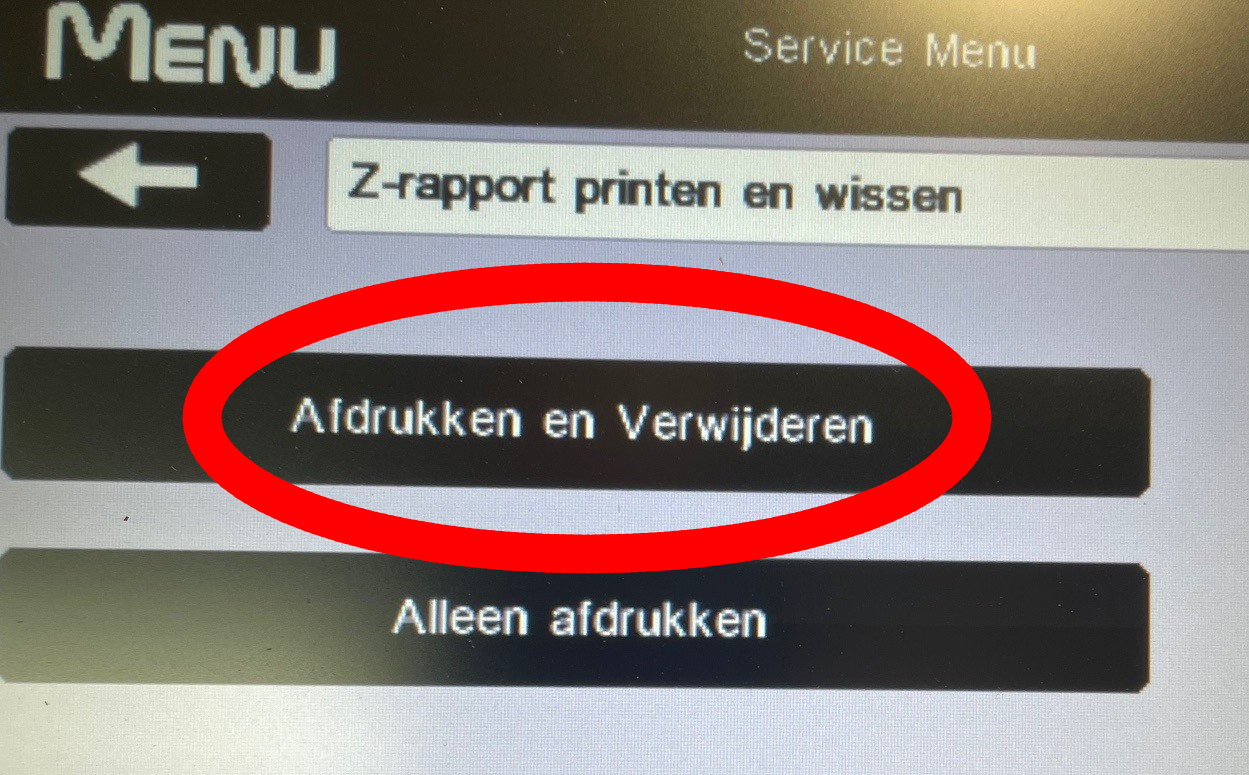 Om het dagelijkse rapport uit te draaien / te wissen klikt u op verwijderingen - Z-rapport printen en wissen. Dit is het dag rapport dat als eerste gewist dient te worden. De rapportages dienen in volgorde gewist te worden. Ofwel; als eerst het dagrapport (z-rapport (niveau-1), dan het week rapport (niveau 2) en als laatste het maand rapport (niveau 3)